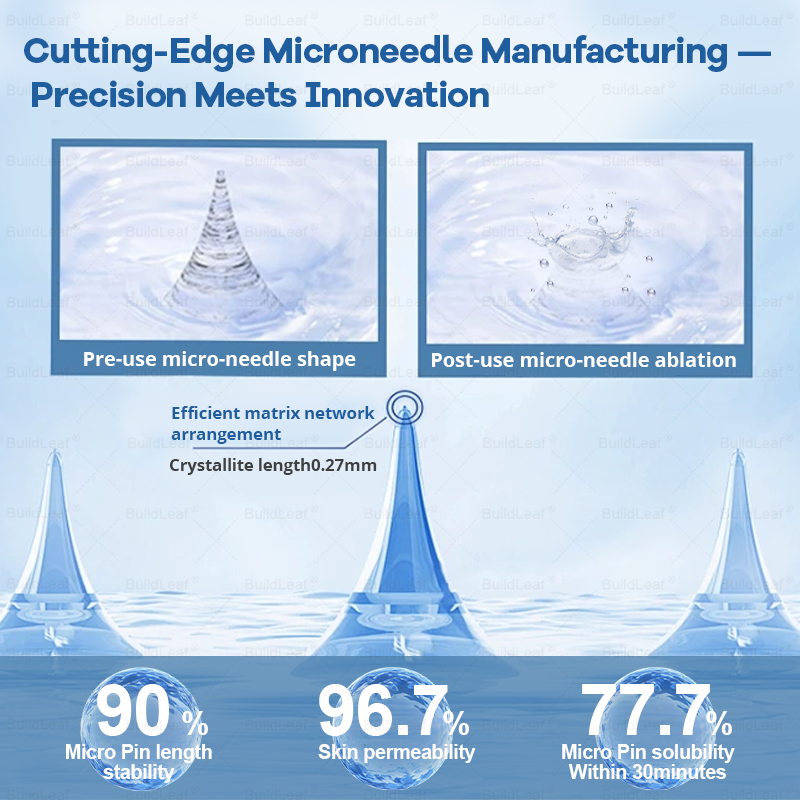 Każda igła ma długość 0,27 mm, czyli zaledwie 1/7 grubości ludzkiego włosa, i jest wykonana z rozpuszczalnego leku. Te mikroigły są precyzyjnie zaprojektowane przy użyciu najnowocześniejszych technik produkcji, aby zapewnić bezszwowe, bezbolesne doświadczenie, jednocześnie skutecznie dostarczając składniki aktywne bezpośrednio do skóry.